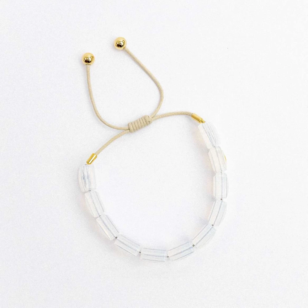 Esta bracelete de cristal é um novo olhar sobre o trabalho com contas tradicional e referências simbólicas. Trabalhada a partir de cristais brancos com lapidação quadrada e acabada com um cordão de algodão encerado ajustável, possui uma lua estampada que simboliza novos começos e a concretização dos seus sonhos. Traga alegria e positividade à sua coleção de bijuteria com esta bracelete especial para usar todos os dias. Esta bracelete faz parte da família Letra, desenhada pela diretora criativa Giovanna Engelbert para a Collection II.