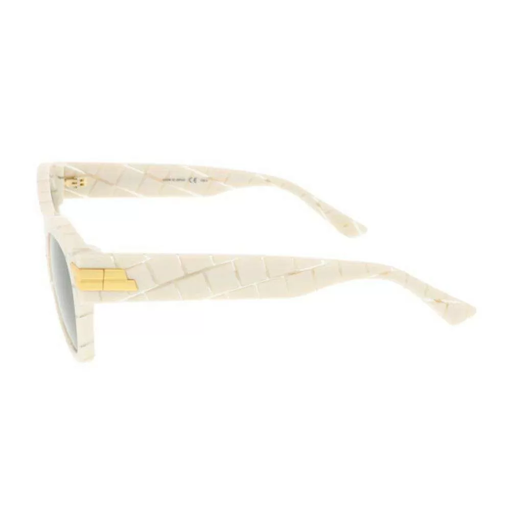 O modelo com armação em acetato branco alia os conceitos comtemporâneos da marca, com um shape robusto e fashionista, ao luxo e sofisticação que estão presentes nos pequenos detalhes da peça, como nas hastes que trazem as linhas caracteristicas da Grife Bottega Veneta em uma refinada ferragem nas laterais da peça.  Este óculos com certeza é um dos acessórios de luxo perfeito para quem busca modernidade sofisticação.