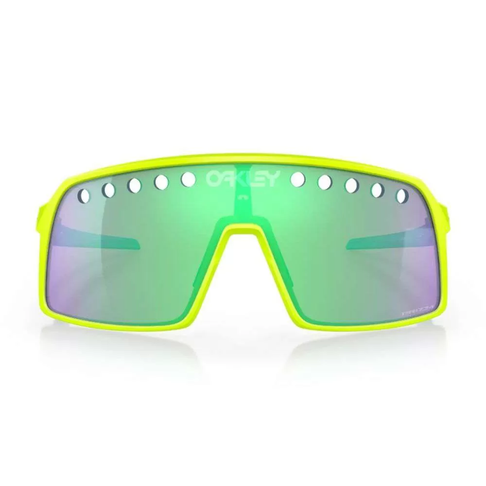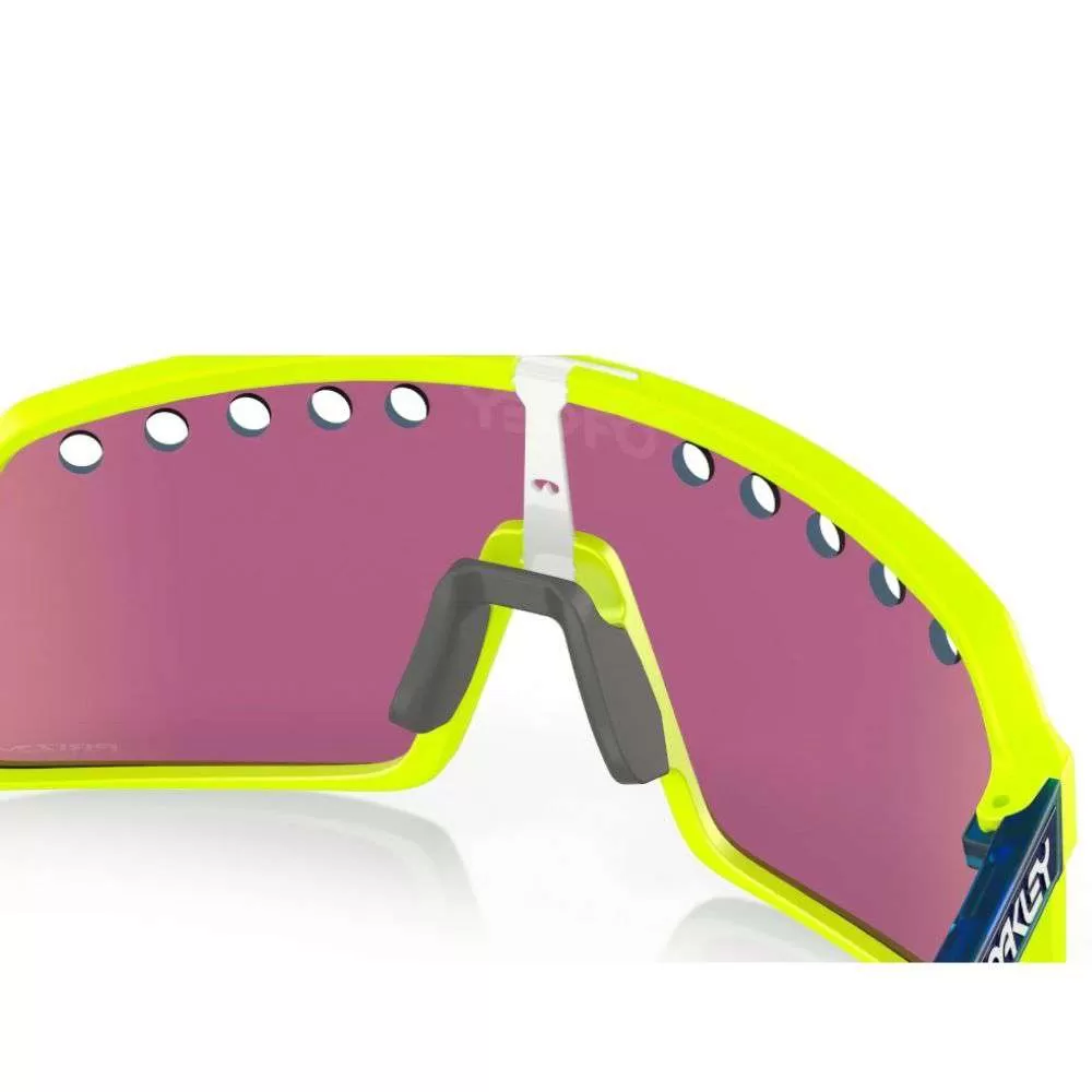 A Oakley foi iniciada em 1975 por Jim Jannard, o nome Oakley foi dado em homenagem ao cão de Jim Jannard, um Setter inglês. Imagine uma marca que é reconhecida pelos desenhos espalhafatosos de alguns dos seus produtos, pela inovação constante com o uso de tecnologia de ponta, pelo design extremamente futurista e pela mistura inteligente de arte e ciência. Pensou na Oakley? Acertou em cheio. Este óculos de sol é perfeito para quem busca estilo e conforto na hora das suas práticas esportivas, sua armação é em acetato amarelo neon e haste azul, design amplo e curvado, suas lentes são espelhadas em tom de furta-cor.