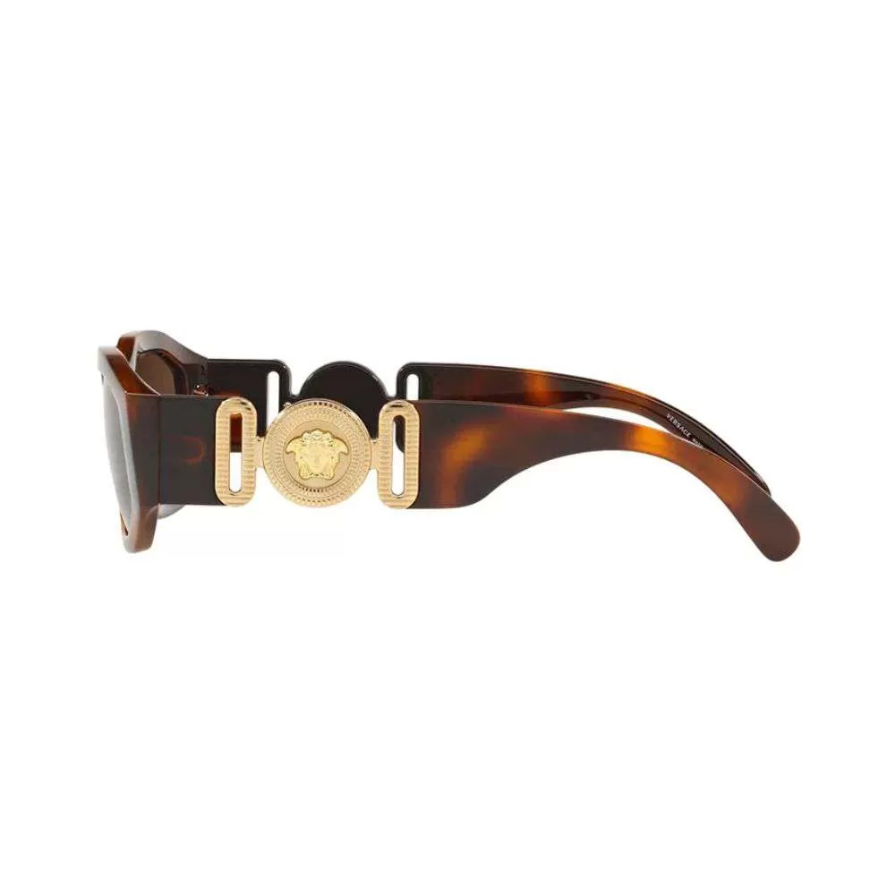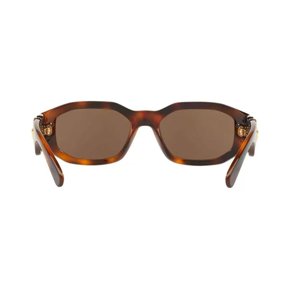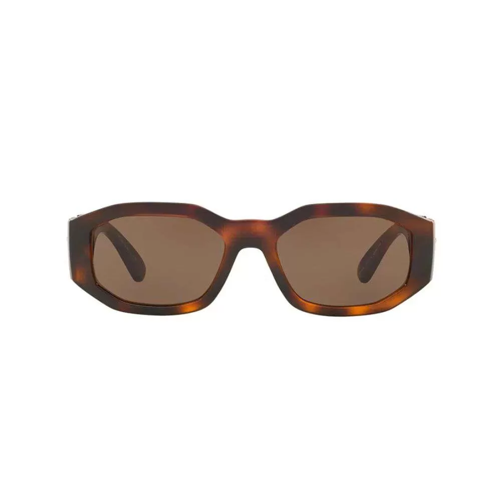 A icônica marca Italiana Versace é sinônimo de puro glamour.È mundialmente conhecida e adorada por todos e foi criada em 1968 pelo desing Gianni Versace em Milão. Conhecida por trabalhar com vestuário, acessório e jóias em 2003 expandiu seu negócio e começaram a exportar óculos de grau e sol.O Óculos de sol VE4361 tem a armação toda em acetato tortoise, seu design é reto, lentes marrom e hastes largas com a icônica medusa da grife em dourado..